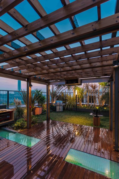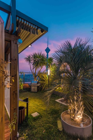 در روف گاردن اختصاصی پنت هاوس این پروژه یک استخر شنای بزرگ،جکوزی ۱۰ نفره با ویو بی نظیر و پالم های ۱۲ متری هر کدام به وزن ۲ تن استفاده شده است.